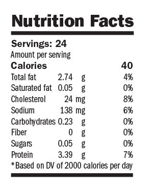 Nutrition Facts: Servings: 4; Amount per serving: Calories 420; Total fat 18.3g 28%; Saturated fat 6.5g 33%; Cholesterol 409mg 136%; Sodium 408mg 17%; Carbohydrates 23g 8%; Fiber 1.3g 9%; Sugars 2.8g 6%; Protein 37.7g 75%; Based on DV of 2000 calories per day