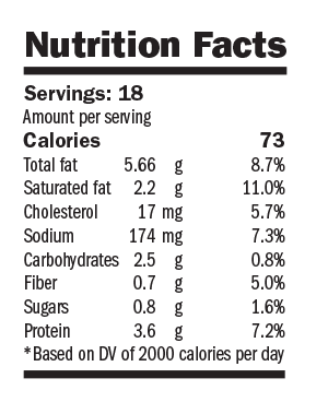 Nutrition Facts: Servings: 8; Amount per serving: Calories 306; Total fat 18.6g 28.6%; Saturated fat 6.5g 32.5%; Cholesterol 80mg 26.7%; Sodium 1583mg 66.0%; Carbohydrates 16.7g 5.6%; Fiber 2.6g 18.6%; Sugars 2g 4.0%; Protein 17.8g 35.6%; Based on DV of 2000 calories per day