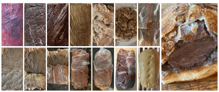 Spread the duxelles evenly and thinly over the prosciutto; place tenderloin at one end of the prosciutto; roll all (not the plastic wrap!) to form a tight log, tucking the ends as you go. Now wrap this log in plastic wrap and twist ends tightly; refrigerate to chill.