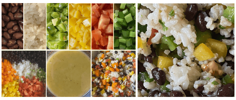 In a serving bowl, combine the black beans, rice, bell peppers, tomato, and green onion.