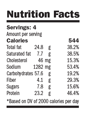 Nutrition Facts: Servings: 6; Amount per serving: Calories 193; Total fat 9.6g 14.8%; Saturated fat 3.6g 18.0%; Cholesterol 54mg 18.0%; Sodium 142mg 5.9%; Carbohydrates 9.3g 3.1%; Fiber 1.2g 8.6%; Sugars 6.8g 13.6%; Protein 17g 34.0%; Based on DV of 2000 calories per day