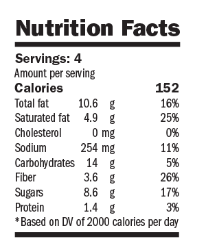 Nutrition Facts: Servings: 8 ; Amount per serving: Calories 360; Total fat 20.3g 31.2%; Saturated fat 7.6g 38.0%; Cholesterol 41mg 13.7%; Sodium 1084mg 45.2%; Carbohydrates 36g 12.0%; Fiber 3.7g 26.4%; Sugars 5.8g 11.6%; Protein 9.8g 19.6%; Based on DV of 2000 calories per day