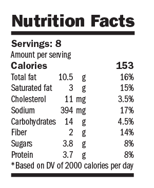 Nutrition Facts: Servings: 8; Amount per serving: Calories 146; Total fat 9g 13.8%; Saturated fat 3.3g 16.5%; Cholesterol 12mg 4.0%; Sodium 184mg 7.7%; Carbohydrates 15.3g 5.1%; Fiber 0.5g 3.6%; Sugars 9.4g 1.0%; Protein 3.2g 6.4%; Based on DV of 2000 calories per day