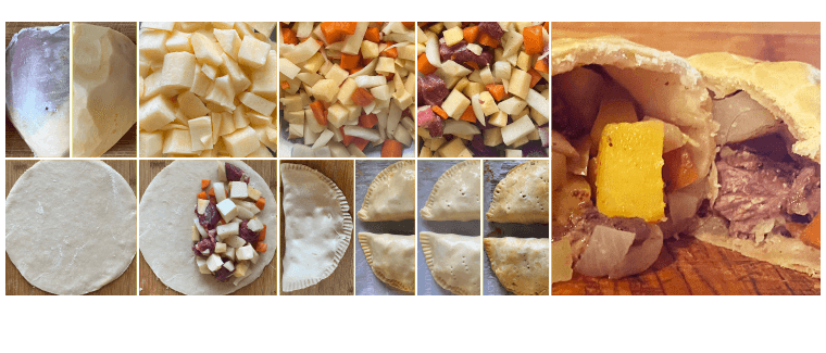 Combine steak, potato, carrot, rutabaga, onion, salt, pepper and thyme in a large mixing bowl; set aside.