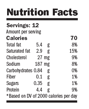 Nutrition Facts: Servings: 8; Amount per serving: Calories 199; Total fat 11.2g 17.2%; Saturated fat 3.9g 19.5%; Cholesterol 57mg 19.0%; Sodium 554mg 23.1%; Carbohydrates 8.4g 2.8%; Fiber 1.5g 10.7%; Sugars 2g 4.0%; Protein 15.6g 31.2%; Based on DV of 2000 calories per day; Based on DV of 2000 calories per day