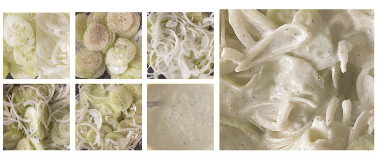 In a medium mixing bowl, combine sliced cucmber and onion in layers, generously shaking salt and pepper on each cucumber layer.