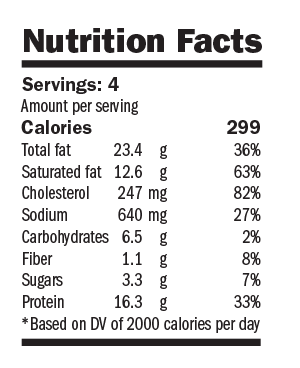 Nutrition Facts: Servings: 8 ; Amount per serving: Calories 372; Total fat 15.3g 23.5%; Saturated fat 7.9g 39.5%; Cholesterol 75mg 25.0%; Sodium 647mg 27.0%; Carbohydrates 33.7g 11.2%; Fiber 1g 7.1%; Sugars 7.3g 14.6%; Protein 25g 50.0%; Based on DV of 2000 calories per day
