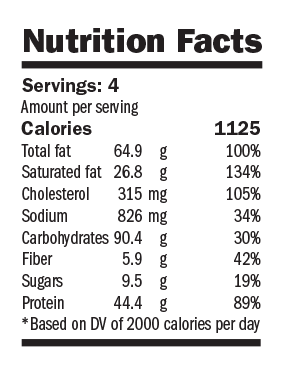 Nutrition Facts: Servings: 8; Amount per serving: Calories 207; Total fat 12.5g 19.2%; Saturated fat 4.1g 20.5%; Cholesterol 13mg 4.3%; Sodium 987mg 41.1%; Carbohydrates 20g 6.7%; Fiber 6.4g 45.7%; Sugars 2.3g 4.6%; Protein 8g 16.0%; Based on DV of 2000 calories per day