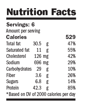 Nutrition Facts: Servings: 4; Amount per serving: Calories 941; Total fat 76.7g 118%; Saturated fat 23.7g 119%; Cholesterol 123mg 41%; Sodium 1847mg 77%; Carbohydrates 34.2g 11%; Fiber 2.3g 16%; Sugars 5.3g 11%; Protein 30.8g 62%; Based on DV of 2000 calories per day