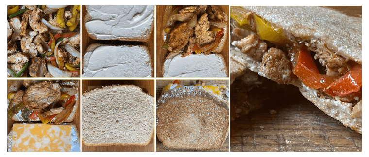 Spread or spoon sour cream on one side of each slice of bread; distribute vegetable/chicken mix to half the slices; top each with cheese slice and another slice of bread, sour cream-sidedown.