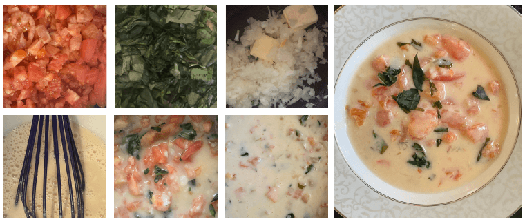 Add¾ of the chopped basil, the chopped tomatoes, the flour/broth mix and the remaining broth, along with the lemon juice and salt to the stock pot.