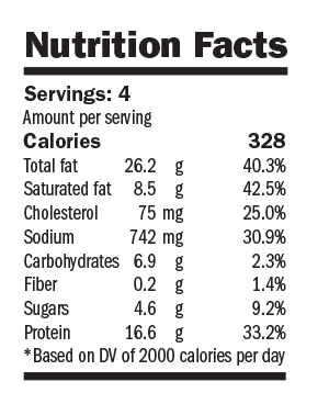Nutrition Facts: Servings: 8; Amount per serving: Calories 555; Total fat 36.5g 56%; Saturated fat 8.6g 43%; Cholesterol 121mg 40%; Sodium 1208mg 50%; Carbohydrates 13.2g 4%; Fiber 4.1g 29%; Sugars 0.5g 1%; Protein 47g 94%; Based on DV of 2000 calories per day