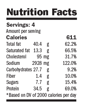 Nutrition Facts: Servings: 4; Amount per serving: Calories 402; Total fat 24.2g 37.2%; Saturated fat 10g 50.0%; Cholesterol 234mg 78.0%; Sodium 980mg 40.8%; Carbohydrates 26.4g 8.8%; Fiber 2.3g 16.4%; Sugars 5.6g 11.2%; Protein 20g 40.0%; Based on DV of 2000 calories per day