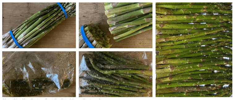 Add the asparagus stalks and shake to coat with the oil blend.