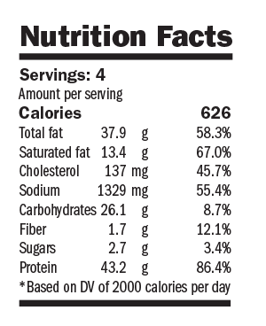 Nutrition Facts: Servings: 6; Amount per serving: Calories 402; Total fat 22.4g 34.5%; Saturated fat 9.7g 48.5%; Cholesterol 111mg 37.0%; Sodium 818mg 34.1%; Carbohydrates 27.8g 9.3%; Fiber 5.2g 37.1%; Sugars 4.5g 9.0%; Protein 22.3g 44.6% ; Based on DV of 2000 calories per day