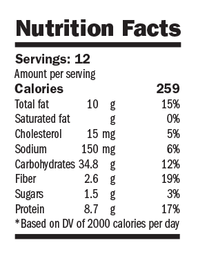 Nutrition Facts: Servings: 8 ; Amount per serving: Calories 168; Total fat 4.3g 6.6%; Saturated fat 0.7g 3.5%; Cholesterol 1mg 0.3%; Sodium 1073mg 44.7%; Carbohydrates 27.7g 9.2%; Fiber 6g 42.9%; Sugars 7.1g 12.0%; Protein 6.6g 13.2%; Based on DV of 2000 calories per day
