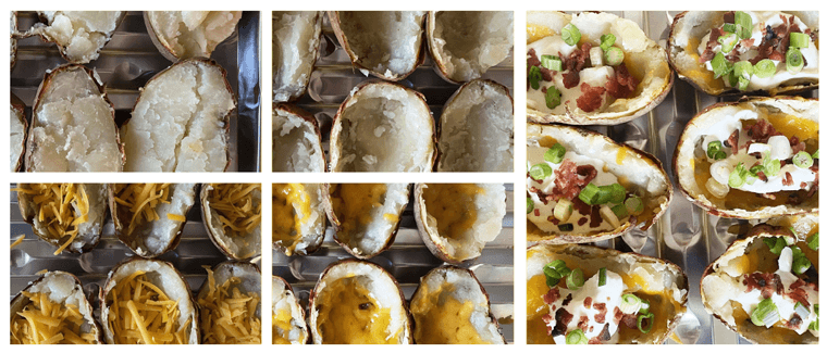 Place each potato half on a baking dish and divide the shredded cheese evenly over the twelve potato skins.