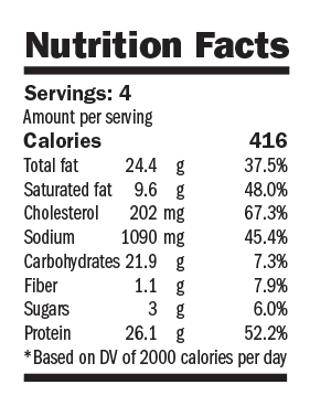 Nutrition Facts: Servings: 4; Amount per serving: Calories 776; Total fat 33g 51%; Saturated fat 15.3g 77%; Cholesterol 147mg 49%; Sodium 2211mg 92%; Carbohydrates 63.7g 21%; Fiber 3.2g 23%; Sugars 6.3g 13%; Protein 55.2g 110%; Based on DV of 2000 calories per day