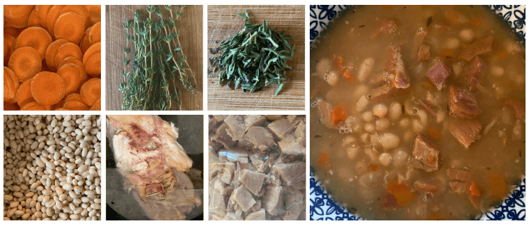 Remove ham bone/hock/shank; add carrots and cubed ham to stock pot.