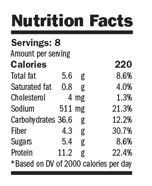 Nutrition Facts: Servings: 24; Amount per serving: Calories 24; Total fat 0.28g 0.4%; Saturated fat 0.04g 0.2%; Cholesterol 48mg 16.0%; Sodium 267mg 11.1%; Carbohydrates 0.99g 0.3%; Fiber 0.3g 2.1%; Sugars 0.49g 1.0%; Protein 4g 8.0%; Based on DV of 2000 calories per day