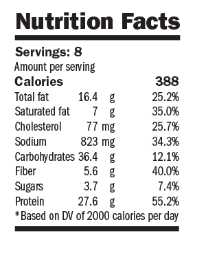 Nutrition Facts: Servings: 8; Amount per serving: Calories 388; Total fat 16.4g 25.2%; Saturated fat 7g 35.0%; Cholesterol 77mg 25.7%; Sodium 823mg 34.3%; Carbohydrates 36.4g 12.1%; Fiber 5.6g 40.0%; Sugars 3.7g 7.4%; Protein 27.6g 55.2%; Based on DV of 2000 calories per day
