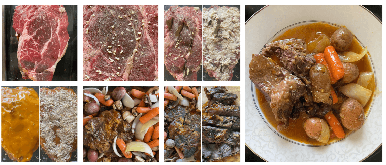 Take roast out of oven, uncover; distribute onions, mushrooms, carrots and potatoes around the roast.