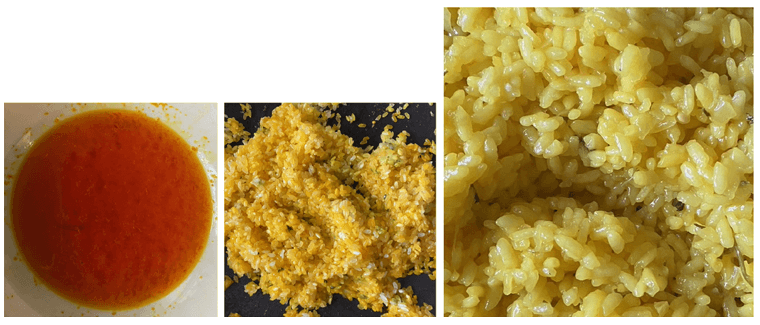 Grind saffron strands to a fine powder (if not purchased powdered); mix with 3 tablespoons water; set aside (this is called “blooming”).