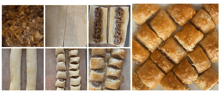 Place the chilled pastry on two greased or lined baking sheets; equally divide the sausage mixture in the center along the entire length of each pastry strip.