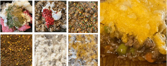 Pour the meat mixture in a casserole or small baking dish. Spread into an even layer. Spoon on the potatoes; carefully spread into an even layer.