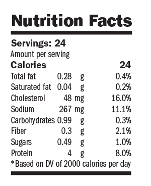 Nutrition Facts: Servings: 8 ; Amount per serving: Calories 355; Total fat 15.8g 24.3%; Saturated fat 8.2g 41.0%; Cholesterol 59mg 19.7%; Sodium 1215mg 50.6%; Carbohydrates 33.8g 11.3%; Fiber 2.3g 16.4%; Sugars 6.1g 4.6%; Protein 19.9g 39.8%; Based on DV of 2000 calories per day