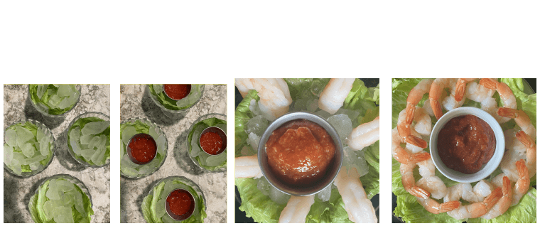 Arrange shrimp as individual servings on a bed of lettuce and ice with a ramiken of sauce, or as a platter with a cup of sauce.