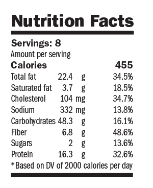 Nutrition Facts: Servings: 8; Amount per serving: Calories 153; Total fat 10.5g 16%; Saturated fat 3g 15%; Cholesterol 11mg 3.5%; Sodium 394mg 17%; Carbohydrates 14g 4.5%; Fiber 2g 14%; Sugars 3.8g 8%; Protein 3.7g 8%; Based on DV of 2000 calories per day