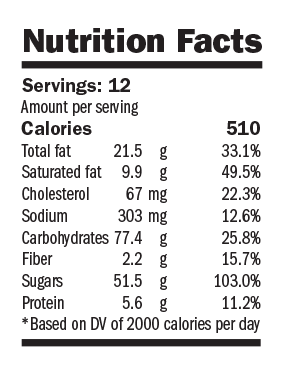 Nutrition Facts: Servings: 12; Amount per serving: Calories 510; Total fat 21.5g 33.1%; Saturated fat 9.9g 49.5%; Cholesterol 67mg 22.3%; Sodium 303mg 12.6%; Carbohydrates 77.4g 25.8%; Fiber 2.2g 15.7%; Sugars 51.5g 103.0%; Protein 5.6g 11.2%; Based on DV of 2000 calories per day