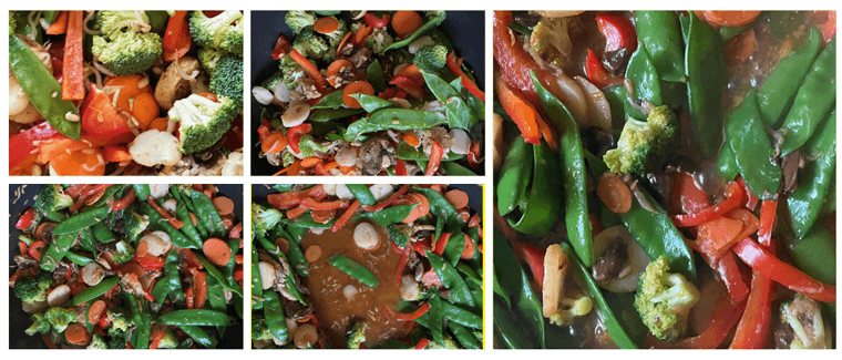 Whisk together the sauce ingredients; pour over the vegetables; stir continuously as sauce thickens and coats the vegetables, ~3 minutes.