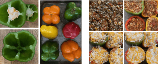 Place 1½ cups of water in a large baking pan; put each pepper upside-down in the water.