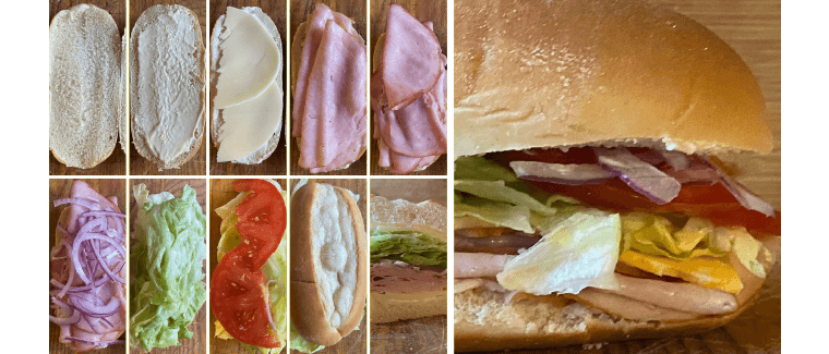 For a hot sub Stack meat(s) and cheese(s) on bottom half of rolls; put under a broiler, or in a toaster oven, until cheese melts; proceed with vegetables and step 2