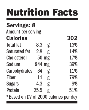 Nutrition Facts: Servings: 4; Amount per serving: Calories 460; Total fat 22.5g 35%; Saturated fat 8g 40%; Cholesterol 166mg 55%; Sodium 2745mg 114%; Carbohydrates 22g 7%; Fiber 4g 29%; Sugars 4g 8%; Protein 41.8g 84%; Based on DV of 2000 calories per day