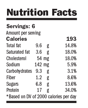 Nutrition Facts: Servings: 24; Amount per serving (raspberries) ; Amount per serving: Calories 64; CTotal fat 0.5g 1%; Saturated fat 0.23g 1%; Cholesterol 1mg 0%; Sodiummg 0%; Carbohydrates 5g 2%; Fiber 0.7g 5%; Sugars 4g 8%; Protein 8g 16%; Based on DV of 2000 calories per day