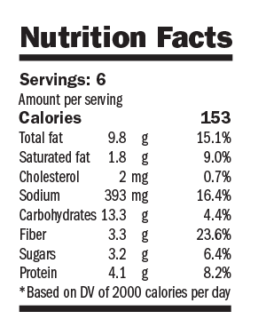 Nutrition Facts: Servings: 8; Amount per serving: Calories 194; Total fat 5.3g 8%; Saturated fat 0.05g 0%; Cholesterol 0mg 0%; Sodium 654mg 27%; Carbohydrates 32g 11%; Fiber 3.7g 26%; Sugars 5.1g 10%; Protein 5g 10%; Based on DV of 2000 calories per day