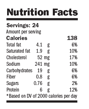 Nutrition Facts: Servings: 12 ; Amount per serving: Calories 136; Total fat 5.1g 7.8%; Saturated fat 3g 15.0%; Cholesterol 15mg 5.0%; Sodium 520mg 21.7%; Carbohydrates 19g 6.3%; Fiber 1.4g 10.0%; Sugars 3.6g 2.8%; Protein 4.3g 8.6%; Based on DV of 2000 calories per day