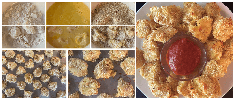 Place the breaded tortellini on the prepared baking sheet, leaving space between the pieces.
