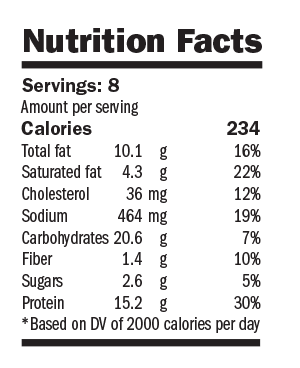 Nutrition Facts: Servings: 8; Amount per serving: Calories 612; Total fat 21.2g 32.6%; Saturated fat 7.3g 36.5%; Cholesterol 181mg 60.3%; Sodium 637mg 26.5%; Carbohydrates 28.4g 9.5%; Fiber 1.4g 10.0%; Sugars 8.5g 17.0%; Protein 64.5g 129.0%; Based on DV of 2000 calories per day