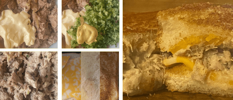 Top cheese with tuna mixture, on each, followed by a slice of bread, butter-side up.