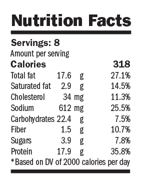 Nutrition Facts: Servings: 6; Amount per serving: Calories 558; Total fat 41.45g 63.8%; Saturated fat 19.5g 97.5%; Cholesterol 107mg 35.7%; Sodium 989mg 41.2%; Carbohydrates 24g 8.0%; Fiber 1.9g 13.6%; Sugars 3.8g 7.6%; Protein 21.9g 43.8%; Based on DV of 2000 calories per day