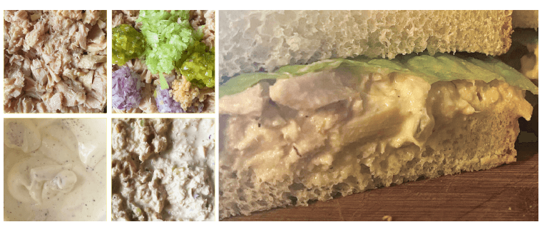 Combine the tuna, mayonnaise, celery, red onion, relish, lemon juice, garlic, salt and pepper in a mixing bowl.