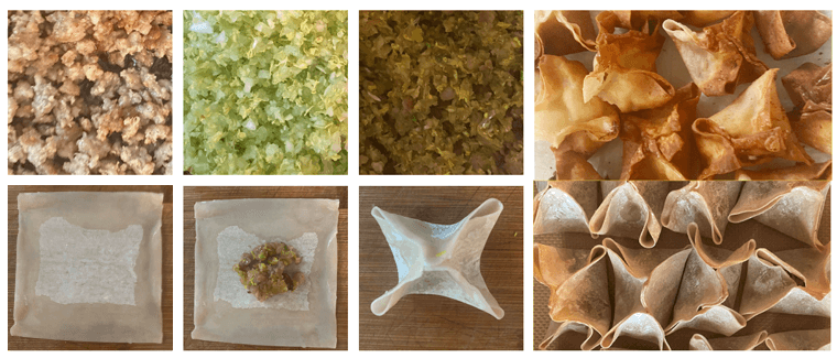Spoon ~1 teaspoon of this filling in the center of a wonton wrapper. Brush the edges of the wonton with water; bring the corners together and press corners and sides; repeat until all filling is used.